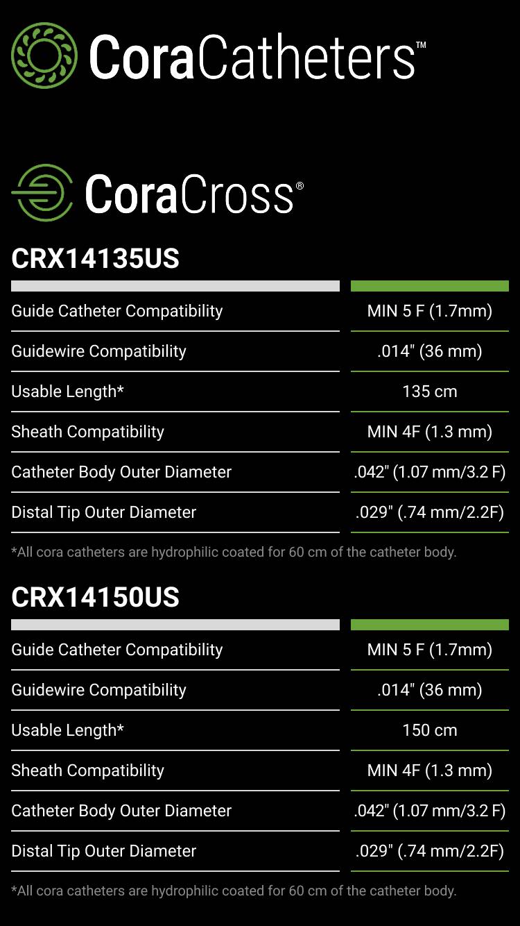 Warnings: Single Use only. Do not reuse/resterilize. Reusing the device could result in compromised device performance, cross-infection and other safety related hazards. Do not use if device is open or packaging is damaged Never advance, withdraw or rotate an intravascular device against resistance until the cause is determined by fluoroscopy. Manipulation, advancement, and/or withdrawal past sharp or beveled edges may result in destruction and/or separation of the outer coating, which may lead to clinical adverse events, resulting in coating material remaining in the vasculature or device damage. This may result in adverse events requiring additional intervention. Avoid wiping the device with dry gauze as this may damage the device coating. Avoid excessive wiping of the coated device. Avoid using alcohol, antiseptic solutions, or other solvents to pre-treat the device because this may cause unpredictable changes in the coating which could affect the device safety and performance. Avoid pre-soaking devices, as this may impact the coating performance and has not been tested. The safety and effectiveness of the coated device has not been established, or is unknown, in vascular regions other than those specifically indicated. The performance of the Cora Cross device has not been assessed in crossing CTOs, especially in the coronary vasculature.