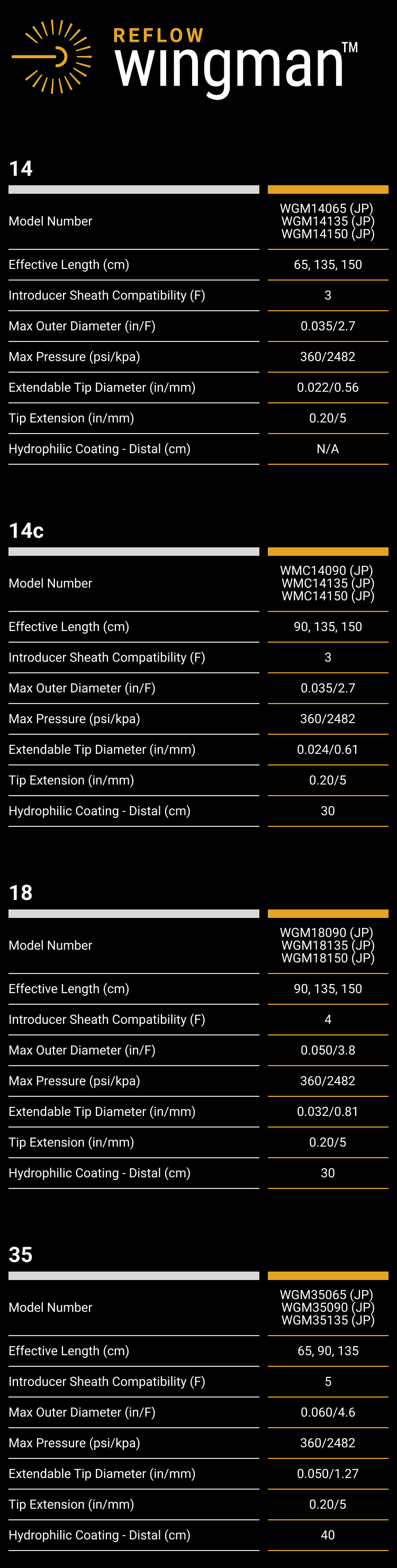 The Wingman Crossing Catheters (14/14C/18/35) are intended to be used in conjunction with steerable guidewires to access discrete regions of the peripheral vasculature. It may be used to facilitate placement and exchange of guidewires and other interventional devices, including facilitation of the intraluminal placement of diagnostic/ interventional devices beyond peripheral stenotic lesions (including chronic total occlusions [CTOs]) and provide a conduit for delivery of saline solutions or diagnostic/therapeutic agents.